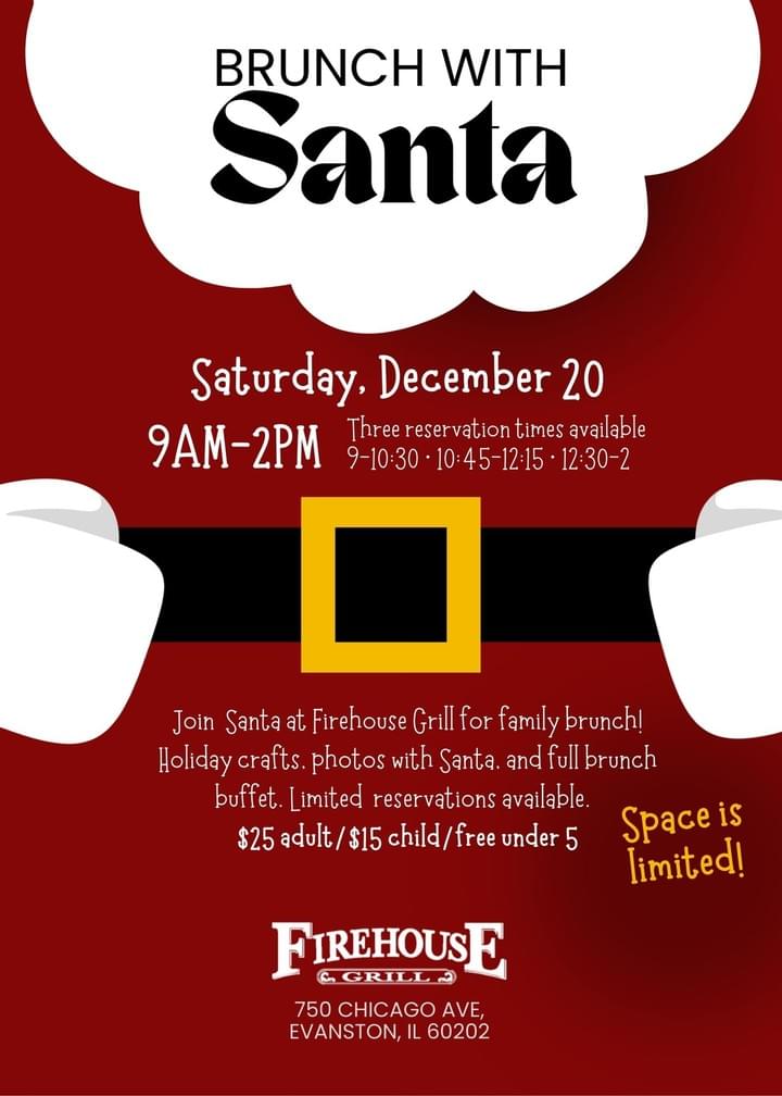 Get ready for a fun-filled morning at our Brunch with Santa in at Firehouse Grill Evanston! Bring your family and friends to enjoy some tasty food, holiday cheer, and a chance for the kids to meet Santa Claus in person. There will be a full brunch buffet, holiday crafts, photos with Santa, and more! Limited reservations available.