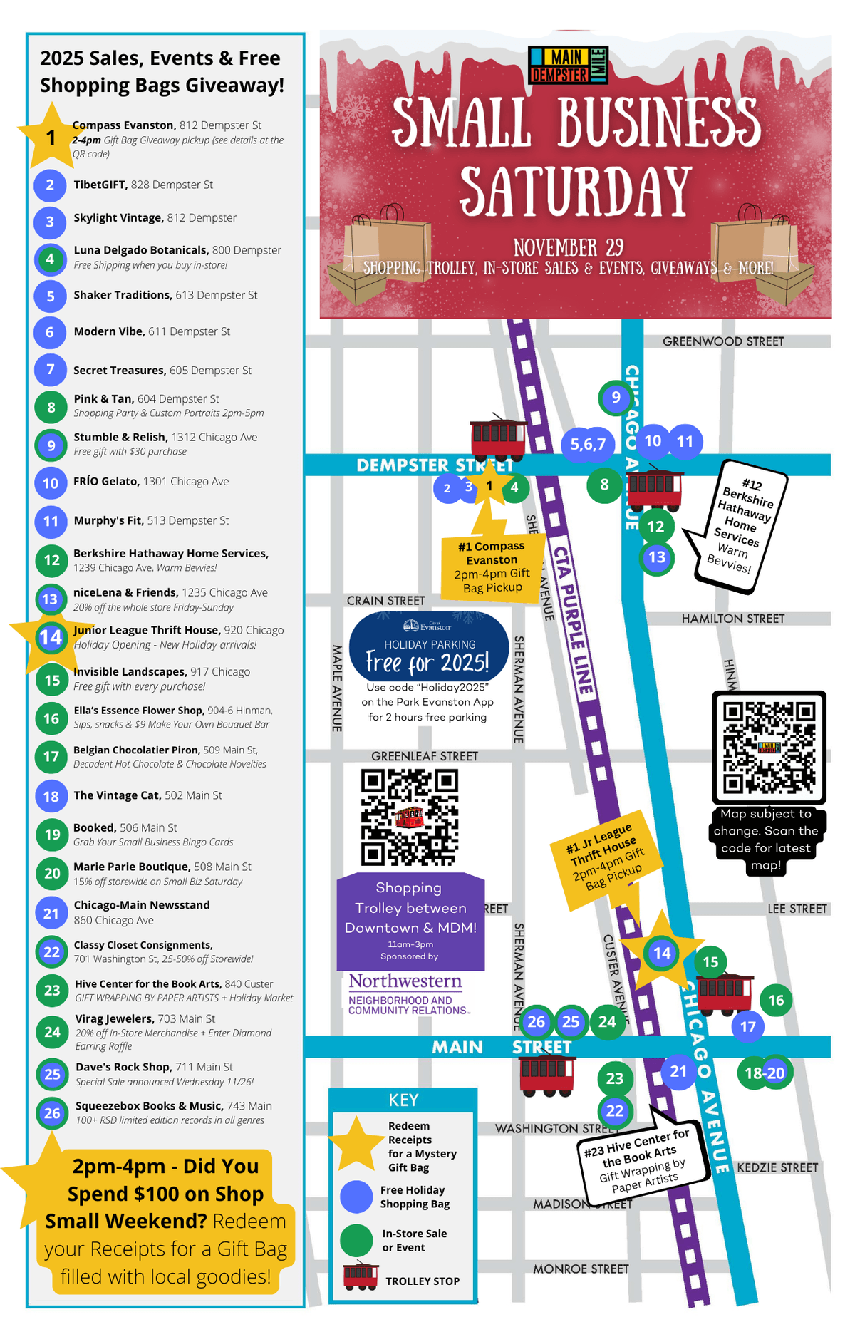 Show us your receipts totalling $100 spent in shops on Main, Dempster or Chicago Ave in between and you'll get a mystery gift bag full of merchandise donated by shops like Stumble & Relish, niceLena & Friends.